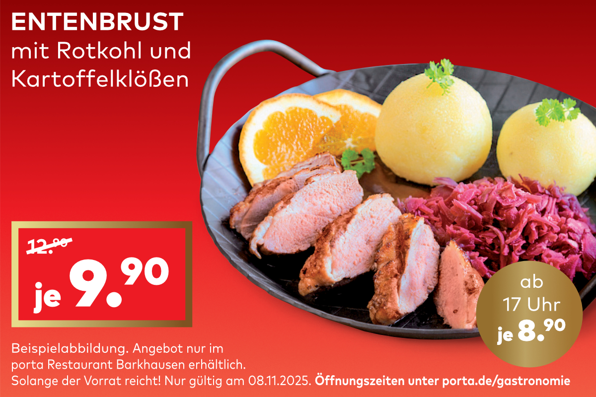 Nur zum Mega Moonlight Shopping am Samstag (8.11.) könnt Ihr Euch z.B. die Entenbrust mit Rotkohl und Kartoffelklößen für nur 9,90 statt 12,90 Euro schmecken lassen.