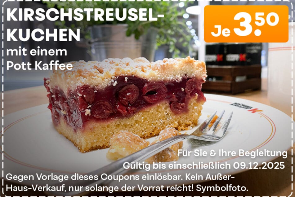 Hier den Coupon sichern! - Kirschstreuselkuchen mit einem Kaffee