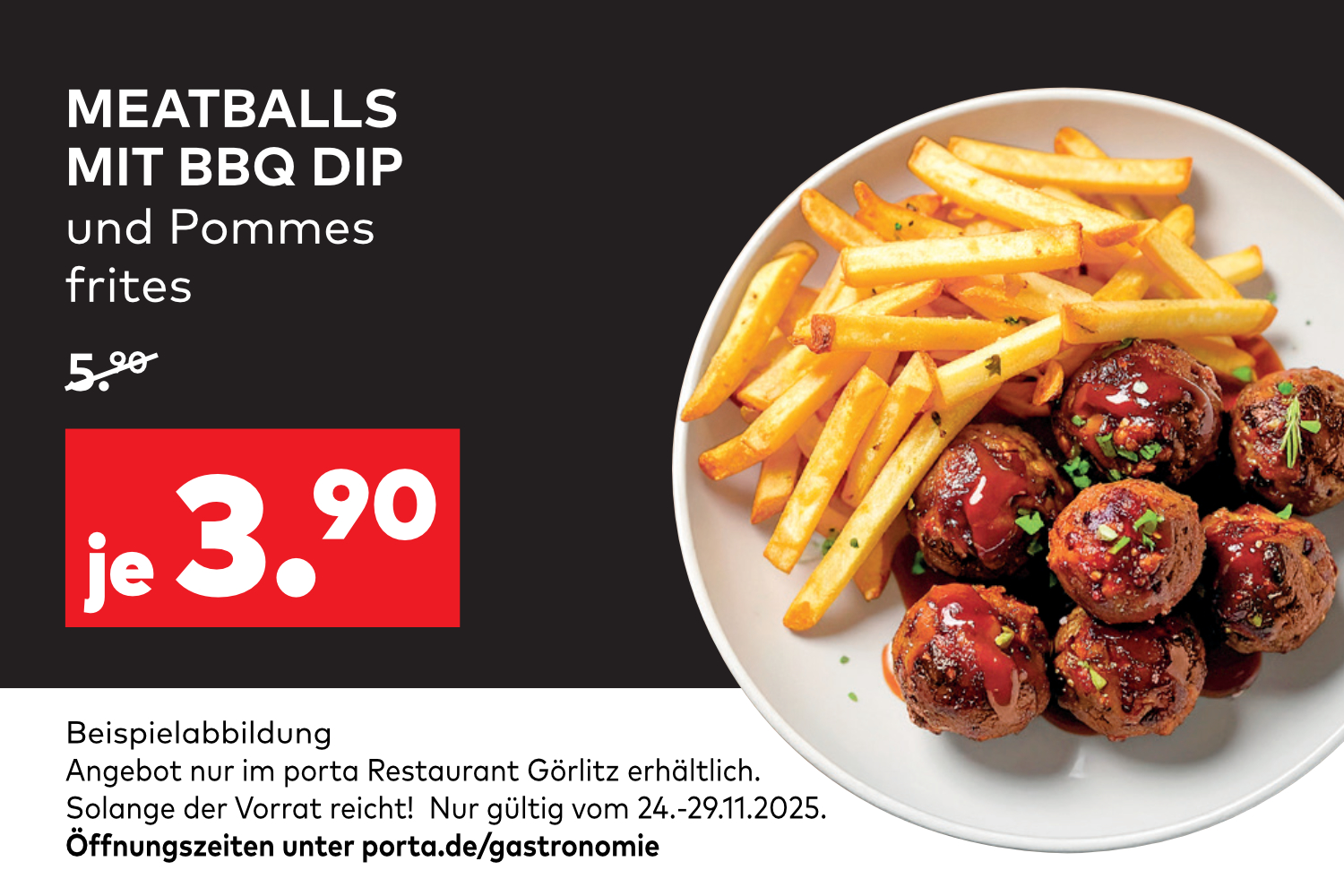 Klopsiki z sosem BBQ i frytkami za 3,90 euro zamiast 5,90 euro.