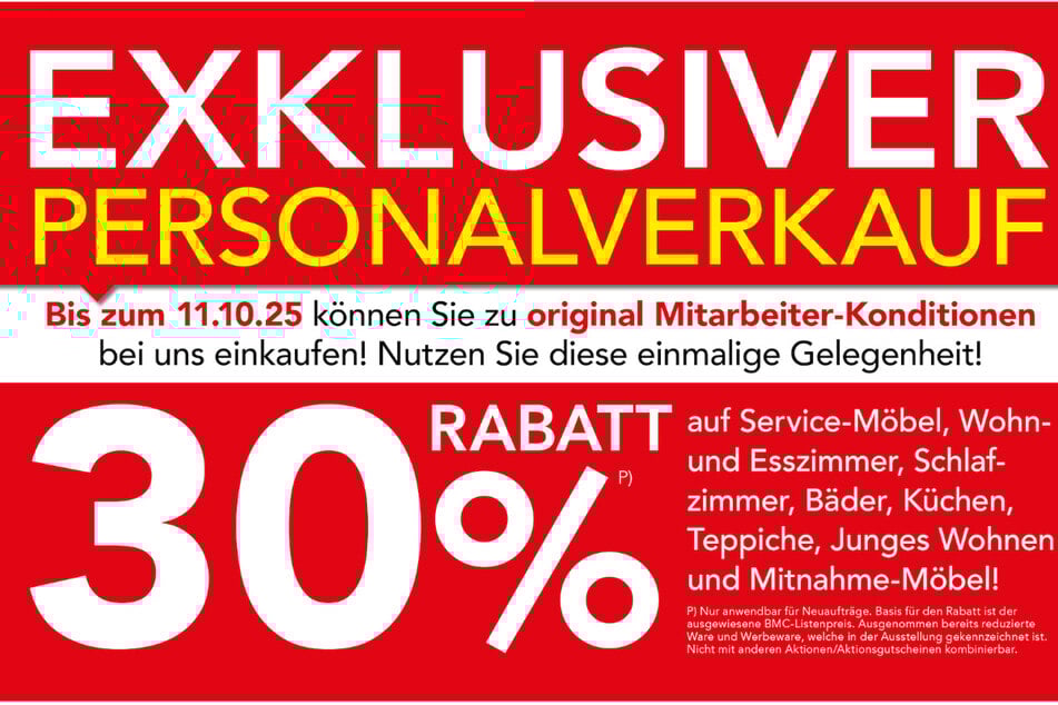 Nur noch bis Samstag (11.10.) könnt Ihr beim großen Personalverkauf bei Braun Möbel ganze 30 Prozent sparen – und damit den Rabatt sichern, den sonst nur Mitarbeiter bekommen!*