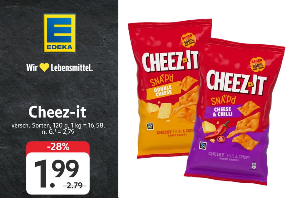 Cheez-it müssen für 1,99 statt 2,79 Euro (-28%) oder mit der App für nur 1,79 Euro (-35%)² natürlich mit dabei sein.