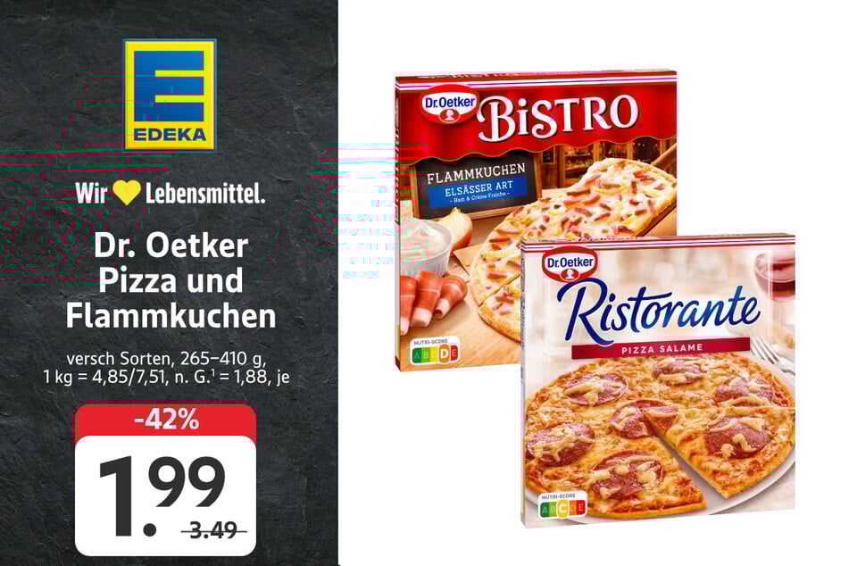 Dr. Oetker Pizza oder Flammkuchen kosten z.B. nur je 1,99 statt 3,49 Euro (-42%) oder mit der App sogar nur 1,79 Euro (-48%)².