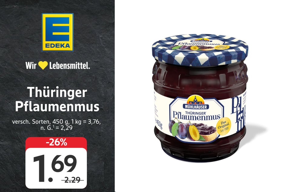 Ein echter Klassiker ist Thüringer Pflaumenmus, jetzt für nur 1,69 statt 2,29 Euro (-26%).