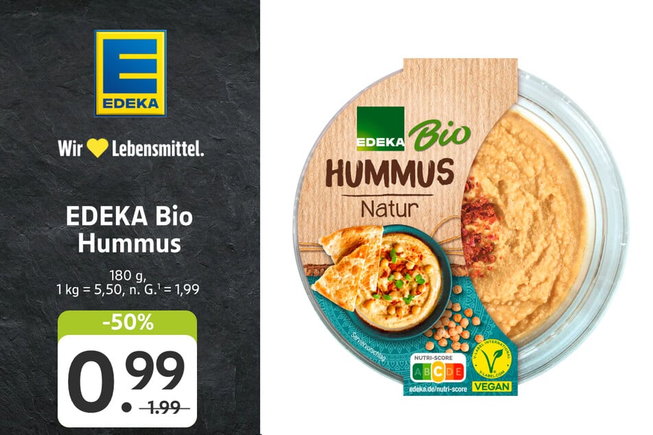 Hummus für nur 0,99 statt 1,99 Euro (-50%) mit Landbrötchen für 1,11 statt 1,29 Euro (-13%) sollten also auf jeden Fall im Einkaufswagen landen.