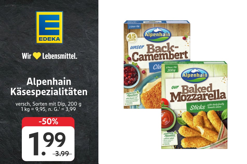Ab Montag (16.2.) wird's lecker und super günstig. Alpenhain Käsespezialitäten kosten nur 1,99 statt 3,99 Euro (-50%).