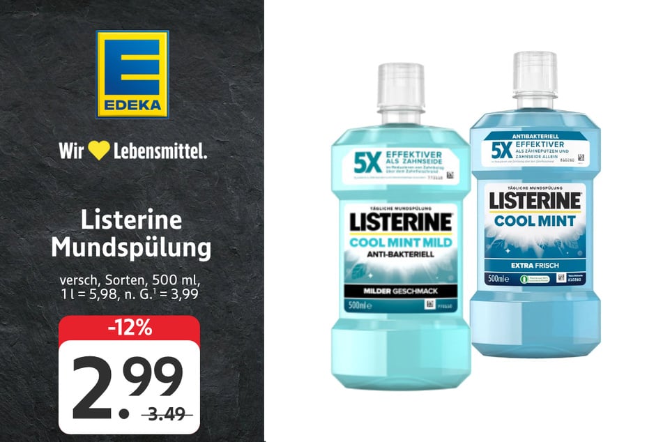 Die Listerine Mundspülung gibt's für 2,99 statt 3,49 Euro (-12%). Mit der kostenlosen EDEKA App zahlt Ihr sogar nur 2,49 Euro (-28%)².