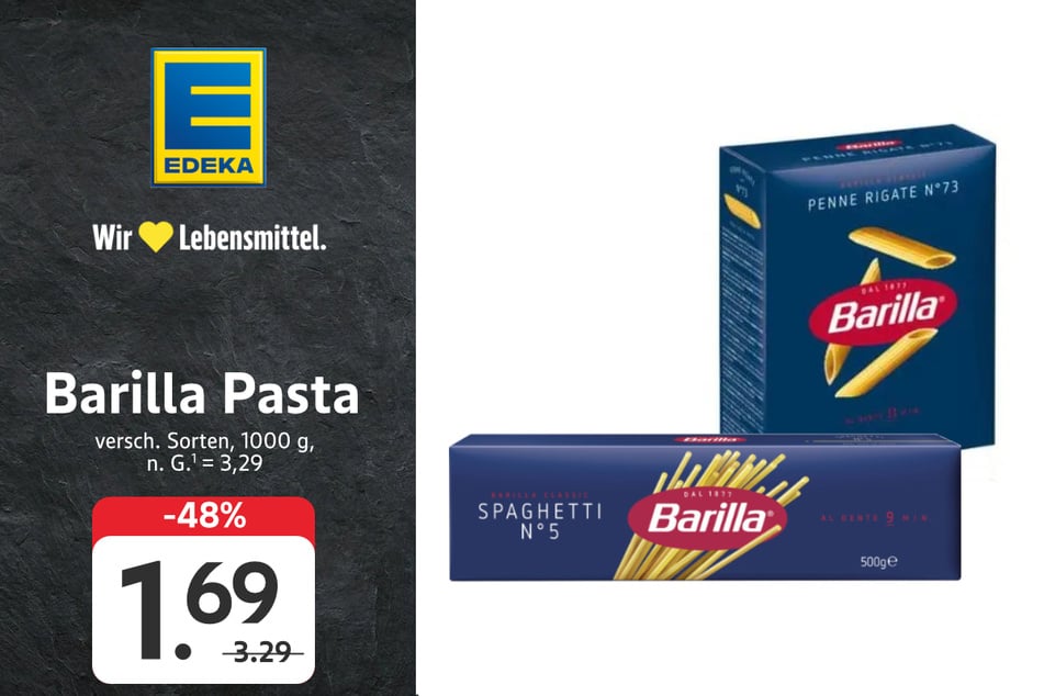 Und die guten Deals bei EDEKA hören nicht auf! Sichert Euch z.B. Barilla Pasta für schlappe 1,69 statt 3,29 Euro (-48%).