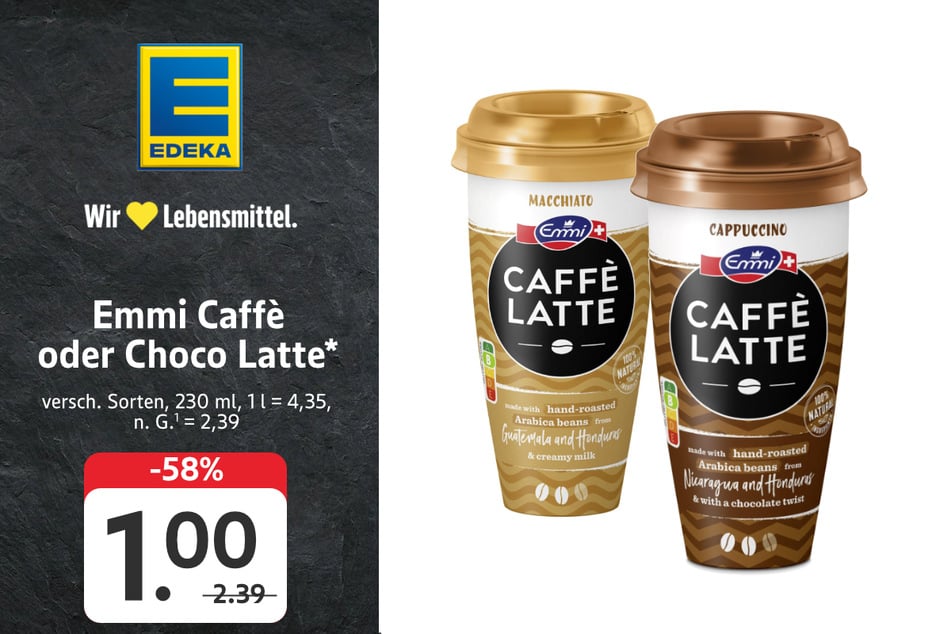 Auch super günstig: Emmi Caffè oder Choco Latte* für 1 statt 2,39 Euro (-58%), Barilla Pasta für 1,69 statt 3,29 Euro (-48%) und Ehrmann Obstgarten für 0,39 statt 0,89 Euro (-56%).