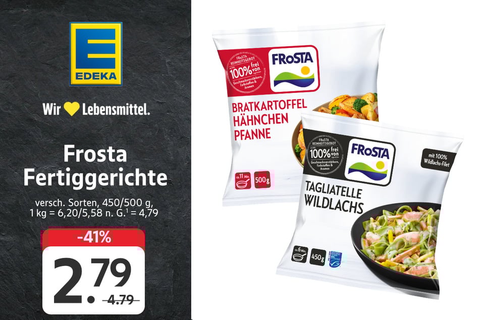 Dazu gehören Frosta Fertiggerichte für 2,79 statt 4,79 Euro (-41%) oder mit der kostenlosen EDEKA App für nur 2,49 Euro (-48%)².