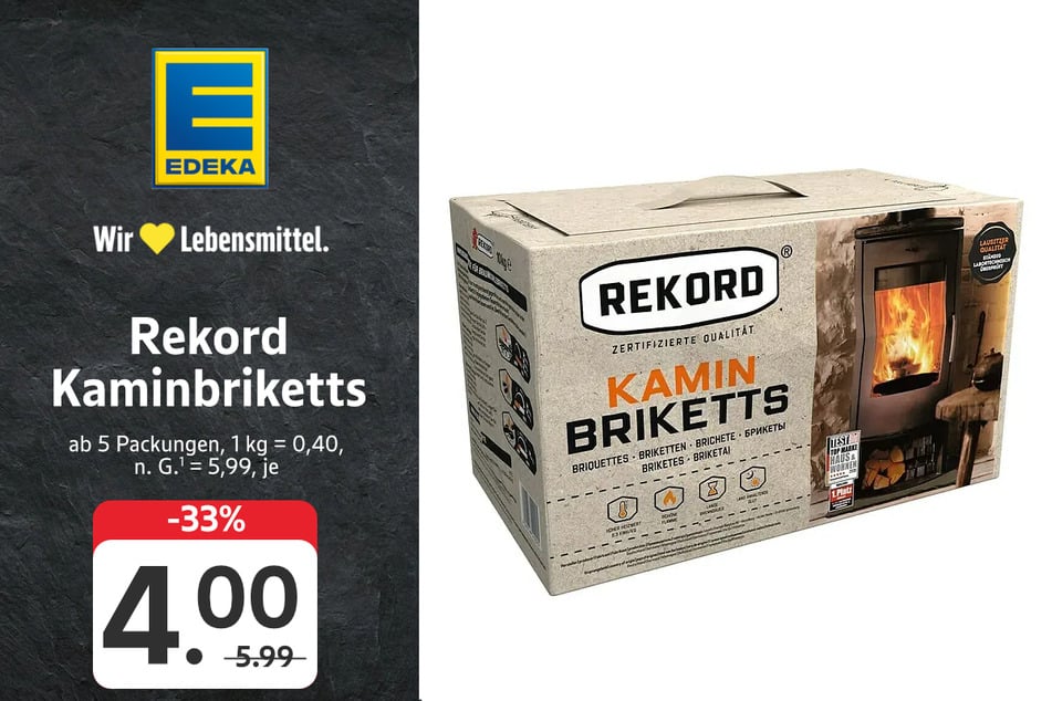 Damit bei den alltäglichen Aufgaben keiner frieren muss, gibt's Rekord Kaminbriketts für je 4 statt 5,99 Euro (-33%) ab vier Packungen.