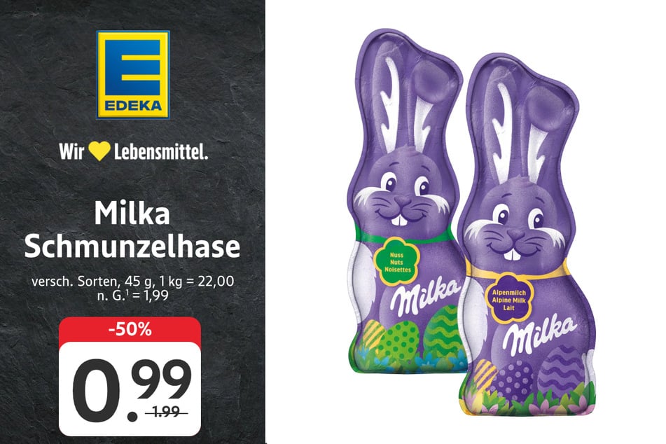 Milka Schmunzelhasen sind gerade für 0,99 statt 1,99 Euro (-50%) zu haben. Mit der EDEKA App zahlt Ihr sogar nur noch 0,88 Euro (-55%)².