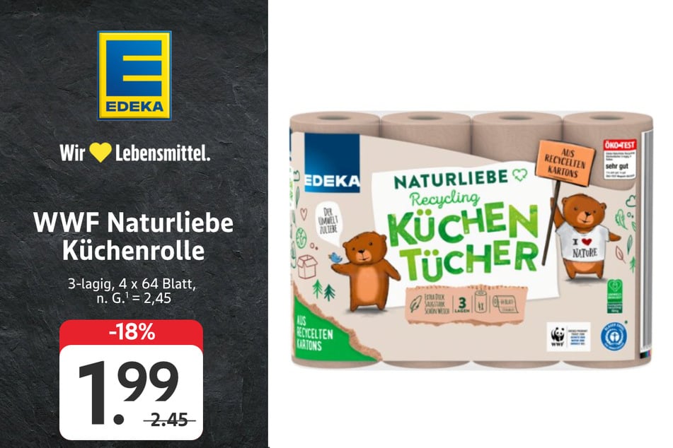 Auch super günstig: WWF Naturliebe Küchenrolle für 1,99 statt 2,45 Euro (-18%), Dr. Oetker Pizza für 2,22 statt 3,69 Euro (-39%) und Maggi Fix, Food Travel oder Herzens Küche für je 0,39 statt 1,09 Euro (-64%).