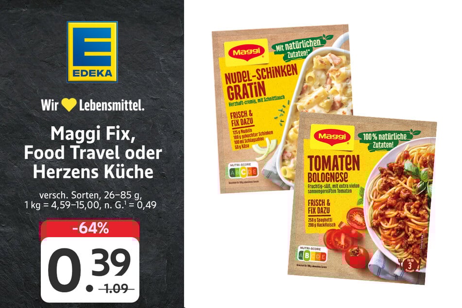 So bekommt Ihr verschiedene Maggi Fix, Food Travel oder Herzens Küche Sorten für je nur 0,39 statt 1,09 Euro (-64%).