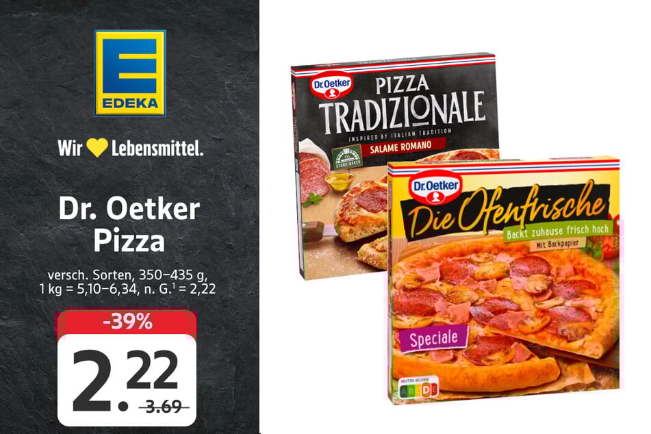 Was bei Eurem nächsten Wocheneinkauf nicht fehlen darf, ist eine Dr. Oetker Pizza für 2,22 statt 3,69 Euro (-39%) oder mit der App für nur 1,99 Euro (-46%)².