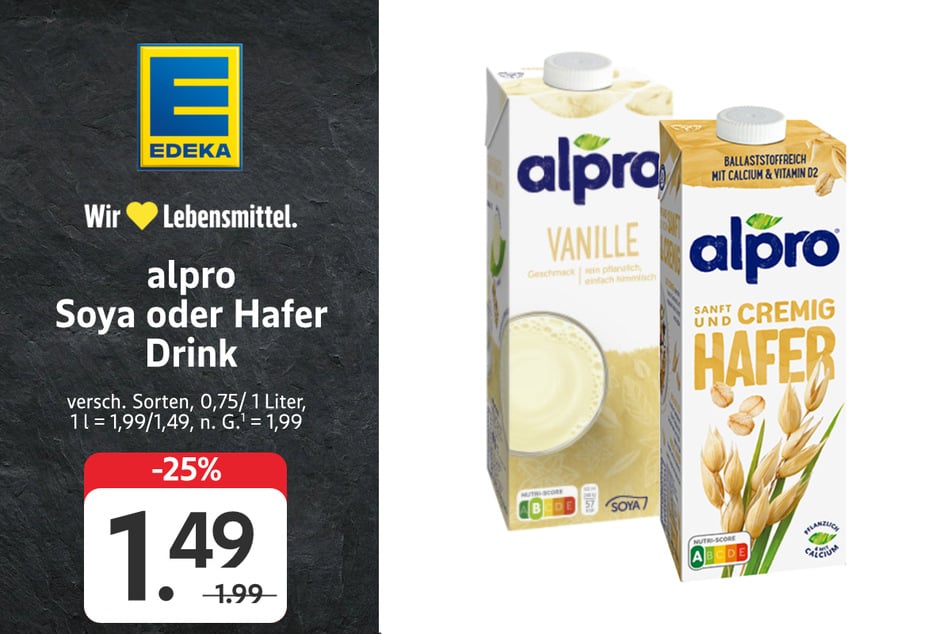 alpro Soya und Hafer Drink gibt's für 1,49 statt 1,99 Euro (-25%). Mit der EDEKA App wird's noch günstiger und Ihr zahlt nur je 1,29 Euro (-35%)!