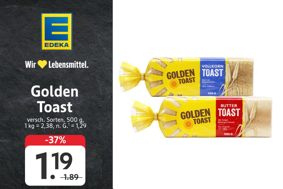 Golden Toast könnt Ihr für schlappe 1,19 statt 1,89 Euro (-37%) mit nach Hause nehmen.