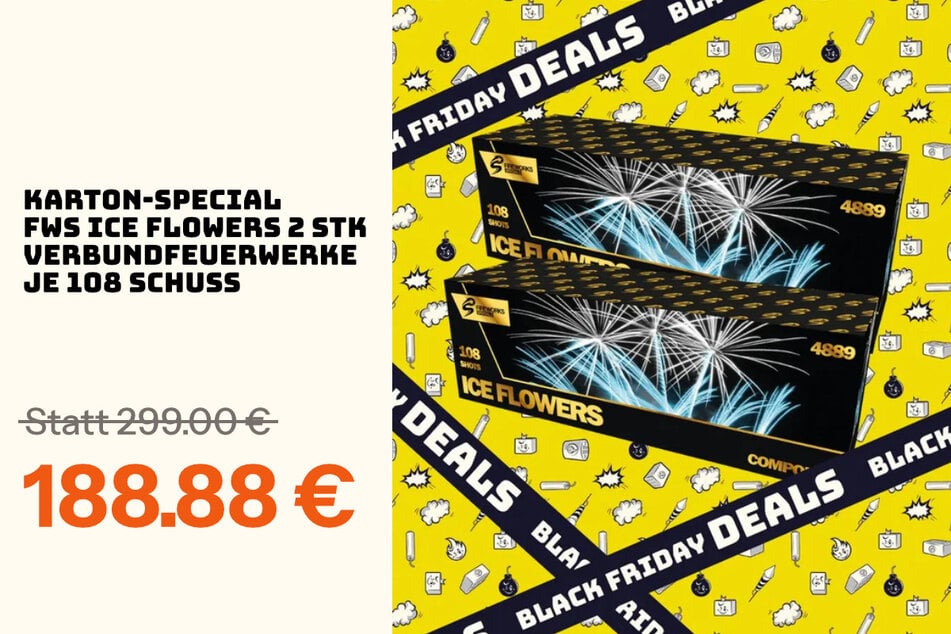 Schnappt Euch z.B. Iskra Furia – Feuerwerksbatterie 25 Schuss für 19,99 statt 29,99 Euro, Karton-Special FWS Ice Flowers 2 Stk – Verbundfeuerwerke je 108 Schuss für 188,88 statt 299 Euro und FREAKDEAL Magnum Rocket Freak für 49,99 statt 75 Euro.