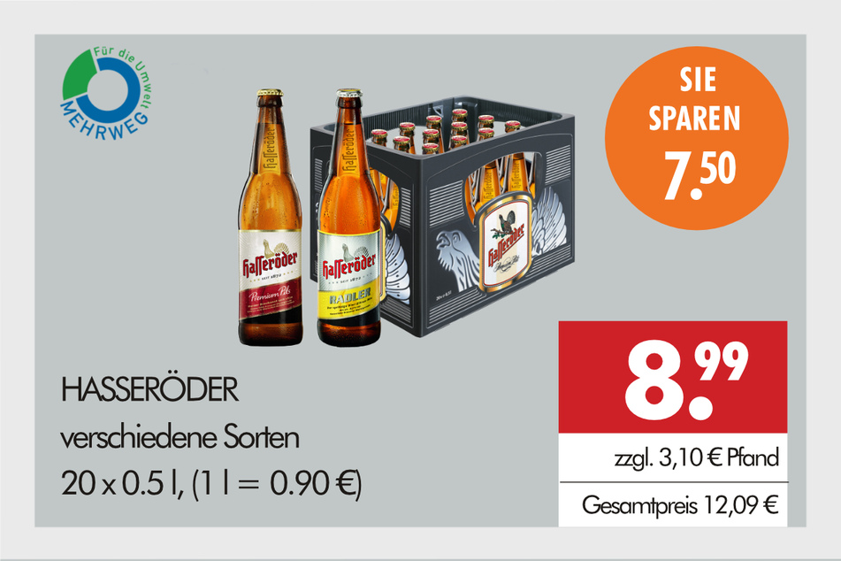 Zum Beispiel erfrischt Ihr Euch an heißen Tagen mit Bad Liebenwerda Mineralwasser für 6,29 Euro je Kasten oder Hasseröder Bier für 8,99 Euro mit 7,50 Euro Rabatt.