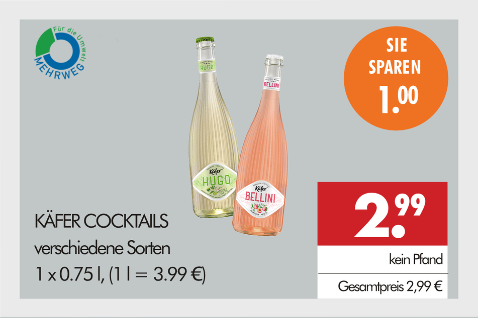 Außerdem gibt's Neuigkeiten aus dem Hause Feinkost Käfer: Neu im Sortiment sind die Ready-to-Drink-Cocktails Bellini und Hugo, die es im Angebot zum Probierpreis von 2,99 Euro gibt.