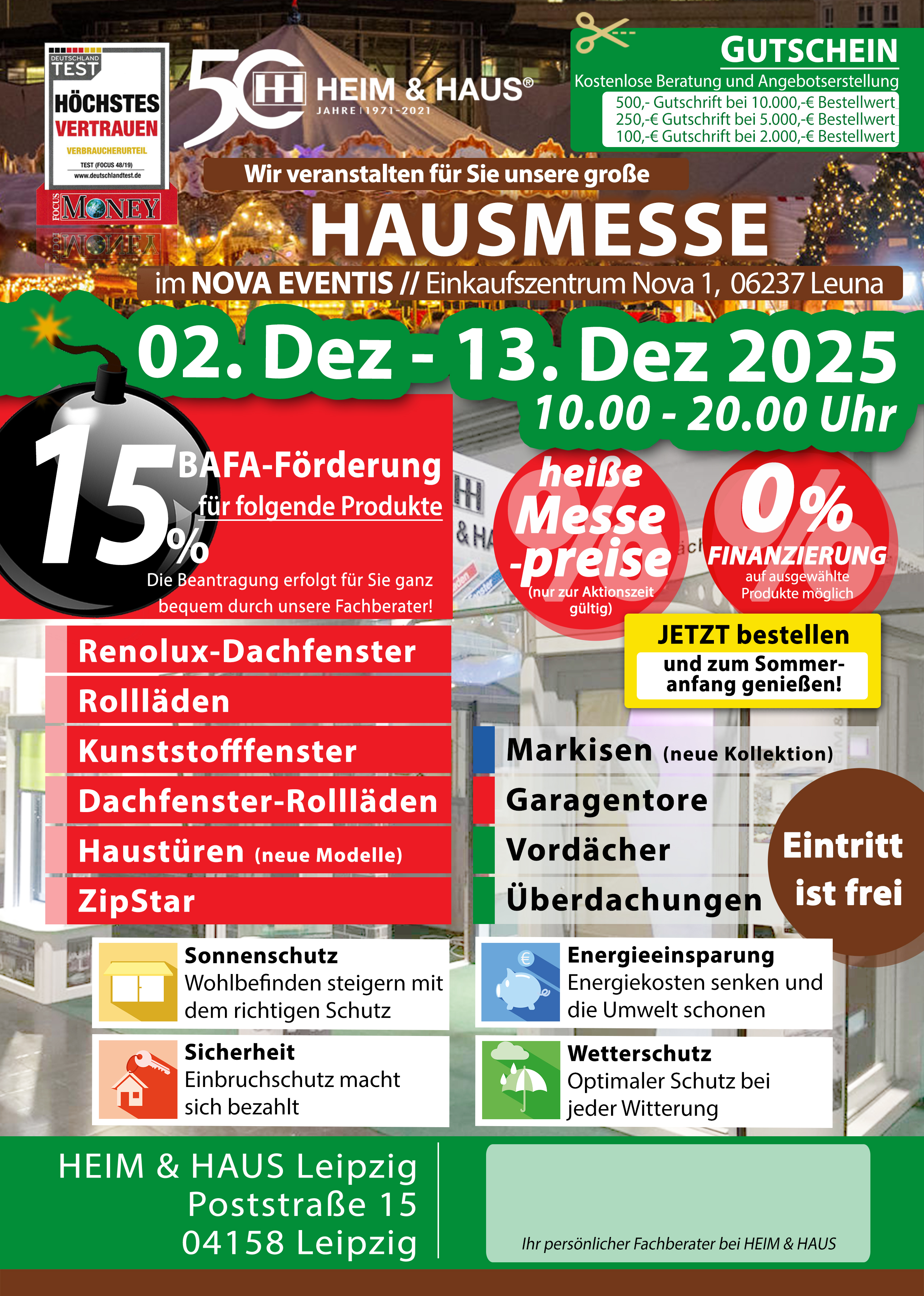 Leuna – Jetzt wird wieder gebaut, beraten und gespart! Vom 2. bis 13. Dezember steigt im NOVA EVENTIS in Leuna die große HEIM & HAUSmesse.