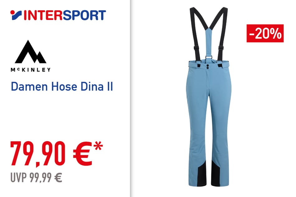 Die McKinley Damen Hose Dina II für 79,90 Euro ist eine gut sitzende Damen-Skihose mit flexibler Slim-Fit-Passform, wasser- und winddichter AQUAMAX-Technologie und nachhaltiger SORONA®-Wattierung, die Dich warm, trocken und komfortabel auf der Piste begleitet.