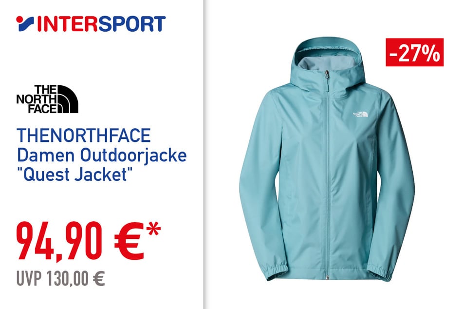 Die robuste wasserdichte THENORTHFACE Damen Outdoorjacke "Quest Jacket" für 94,90 Euro schützt mit DRYVENT™‑Technologie zuverlässig vor Regen und Wind, bietet eine verstellbare Kapuze sowie praktische Reißverschlusstaschen und ist damit ideal für Wanderungen und wechselhafte Wetterbedingungen.