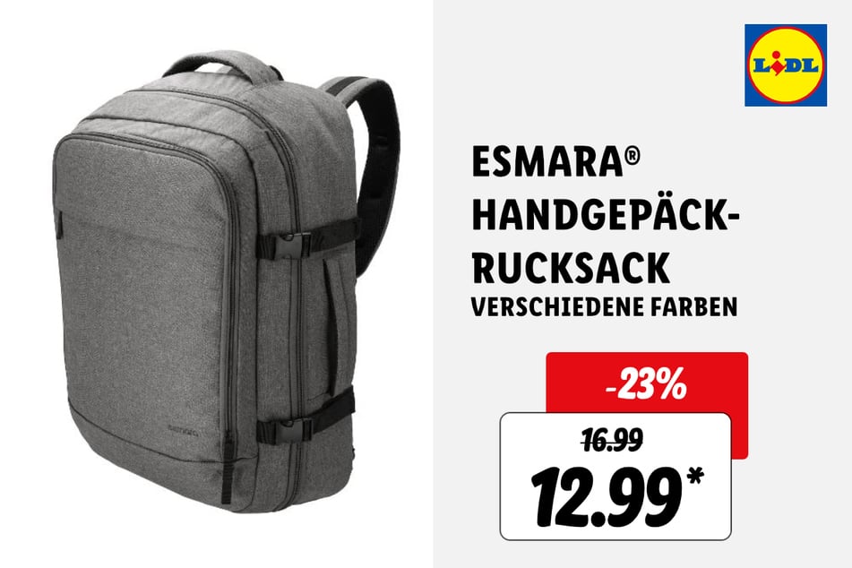 Außerdem gibt's Trolley-Reisekoffer für 27,99 Euro*, Handgepäck-Rucksäcke für 12,99 statt 16,99 Euro* (-23%) und Reise-Dampfbügeleisen (nur online) für 9,99 statt 14,99 Euro* (-33%).
