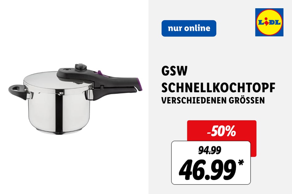 Schnappt Euch zum Beispiel diesen GSW Schnellkochtopf (nur online) für 46,99 statt 94,99 Euro* (-50%).