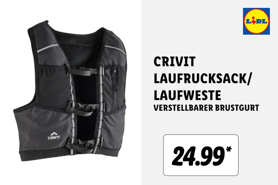 Dieser Crivit Laufrucksack/ Laufweste für 24,99 Euro* ist praktisch und besonders leicht.
