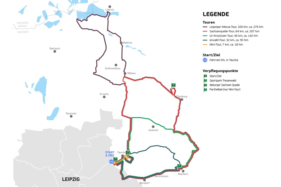- Die Leipziger-Messe-Tour (ca. 100 km): Die Königsetappe beim LVZ-Fahrradfest für ambitionierte Radsportler, die ihr Rennrad lieben und ihre Ausdauer unter Beweis stellen wollen.