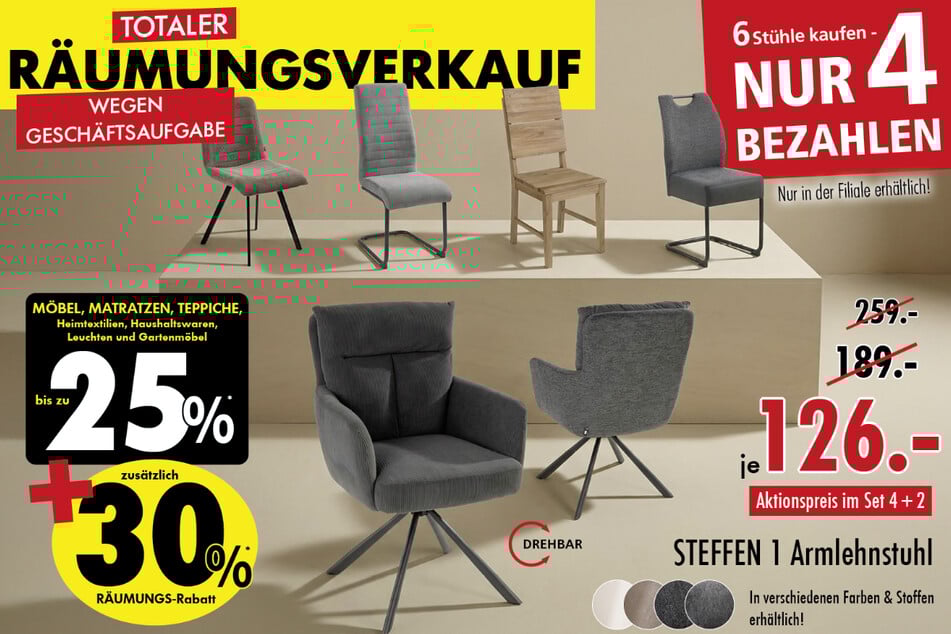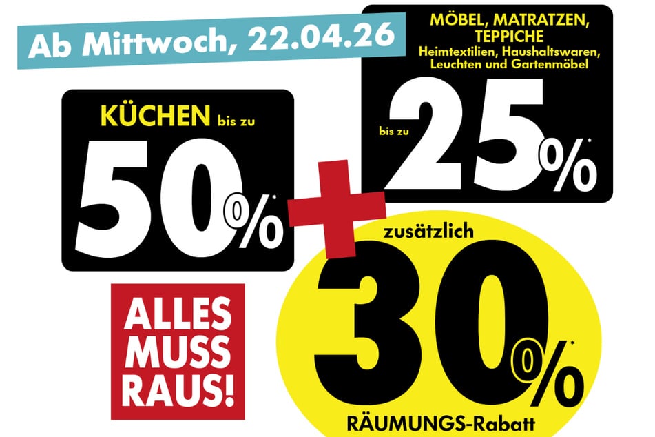 Zum Abschied schenkt Euch das Möbelhaus ab Mittwoch (22.4.) bis zu 80 Prozent, und zwar in allen Sortimentsbereichen.*¹
