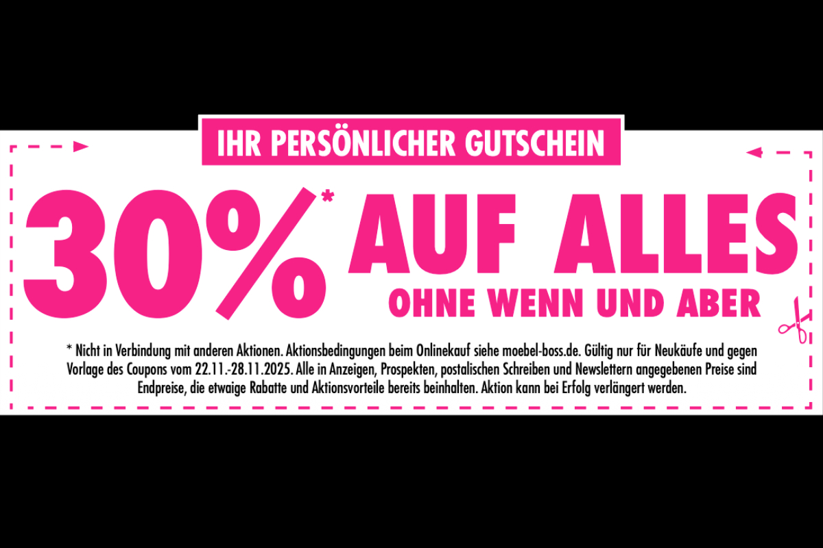 *Nicht in Verbindung mit anderen Aktionen. Aktionsbedingungen beim Onlinekauf siehe moebel-boss.de. Gültig nur für Neukäufe und gegen Vorlage des Coupons vom 22.11.-28.11.2025. Alle in Anzeigen, Prospekten, postalischen Schreiben und Newslettern angegebenen Preise sind Endpreise, die etwaige Rabatte und Aktionsvorteile bereits beinhalten. Aktion kann bei Erfolg verlängert werden.