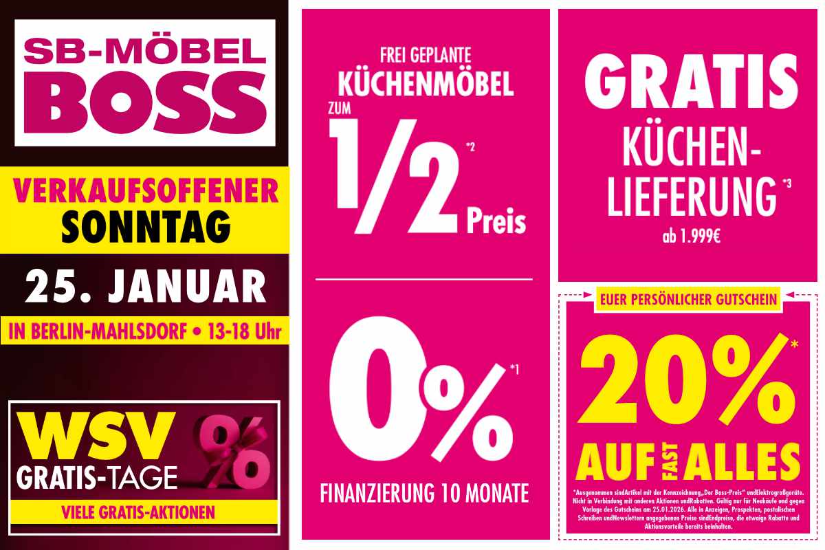 Berlin – Einrichtungs-Fans dürfen sich auf einen verkaufsoffenen Sonntag (25.1.) bei Möbel Boss in Berlin-Mahlsdorf freuen. Dann könnt Ihr von 13 bis 18 Uhr shoppen und mächtig sparen!