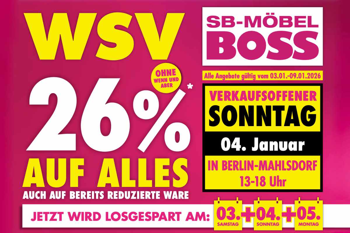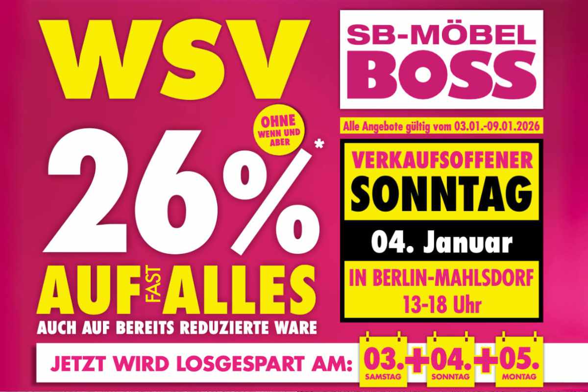 Angebote zur Sonntagsöffnung (4.1.) von Möbel Boss Berlin-Mahlsdorf