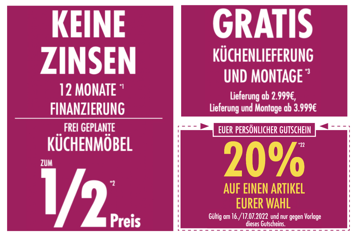*22 Ausgenommen ist bereits reduzierte Ware und Bestellungen aus dem Möbel BOSS-Onlineshop. Gültig nur bei Neukauf. Nur ein Gutschein pro Person einlösbar. Gilt nicht in Verbindung mit anderen Aktionen. Gültig am 16./17.07.2022. Aktion kann bei Erfolg verlängert werden.
