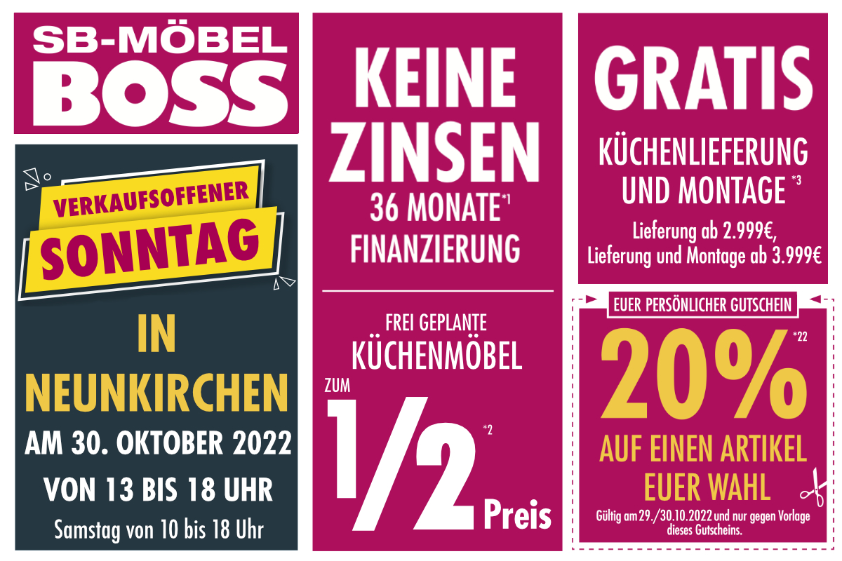 Neunkirchen – Möbel Boss in Neunkirchen startet am Sonntag (30.10.) eine geniale Aktion: Das Möbelhaus bleibt von 13 bis 18 Uhr geöffnet und hat sensationelle Deals.