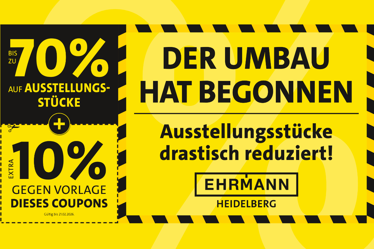 Aber aufgepasst: Die Rabatt-Aktion ist nur noch bis 21. Februar und ausschließlich bei Möbel Ehrmann Heidelberg gültig.