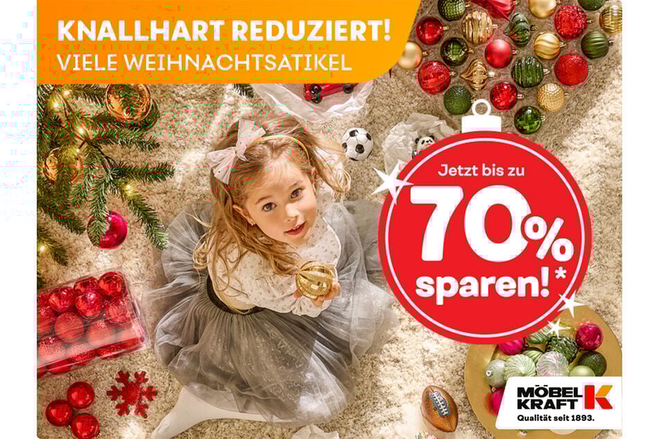 Angebot gültig bis: 06.01.2026. Möbel Kraft gewährt Ihnen 70% Rabatt auf das gesamte Weihnachtssortiment. Der Rabatt i. H. v. 70% wird an der Kasse automatisch abgezogen. Ausgenommen sind Kaufgutscheine, Bücher und Dienstleistungen. Nicht mit anderen Vorteilen, Aktionen oder Werbung kombinierbar. Keine Barauszahlung. Die Aktion ist gültig solange der Vorrat reicht.