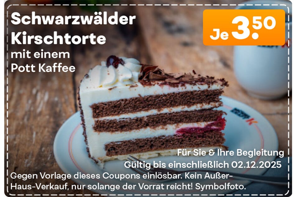 für je 5,90 Euro - Schwarzwälder Kirschtorte mit einem Pott Kaffee