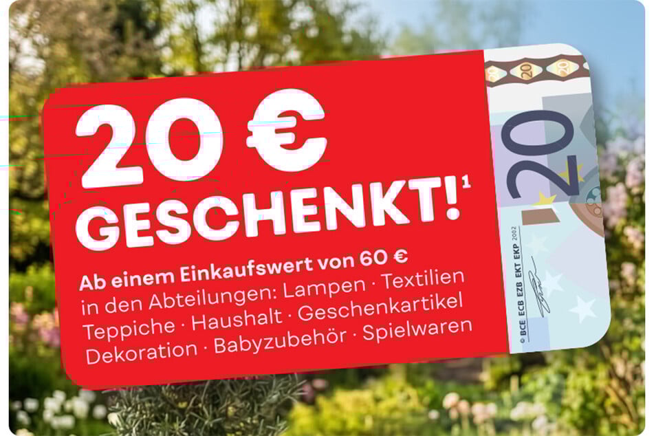 Holt Ihr Euch Sachen aus den Abteilungen Lampen, Textilien, Teppiche, Haushalt, Deko, Geschenkartikel, Babyzubehör und Spielwaren, gibt's ab 60 Euro Einkaufswert 20 Euro Nachlass¹.
