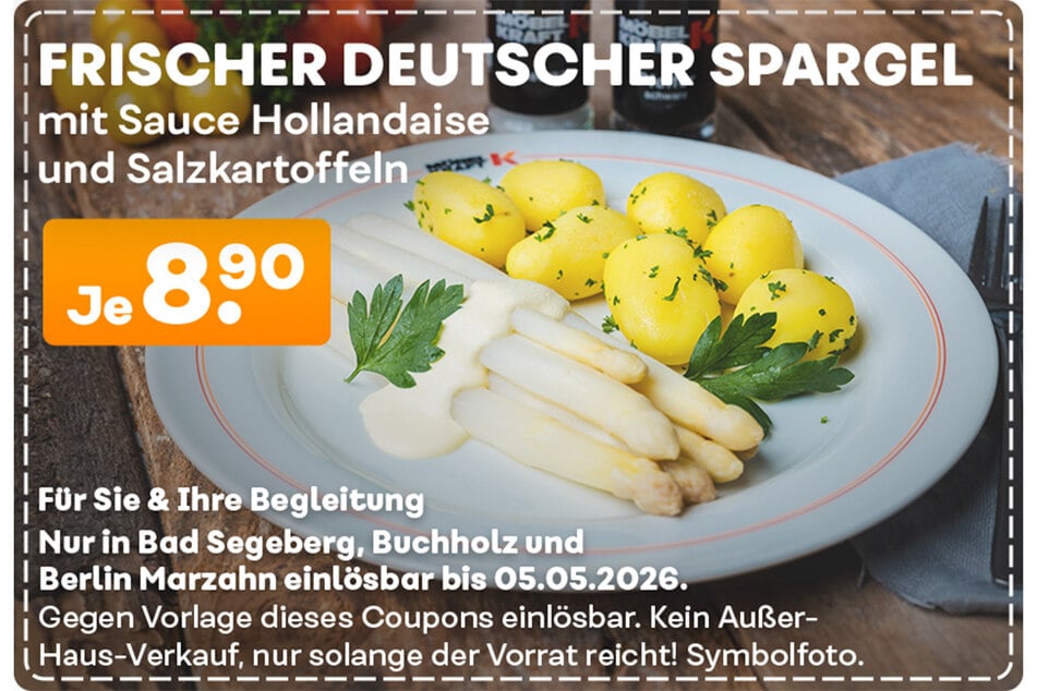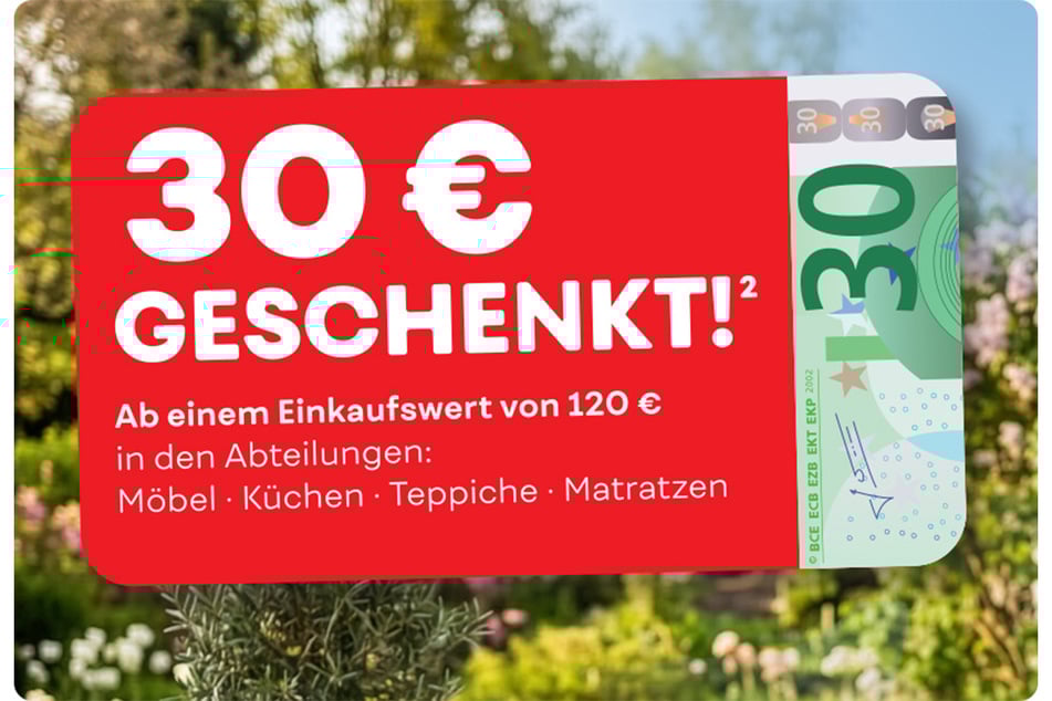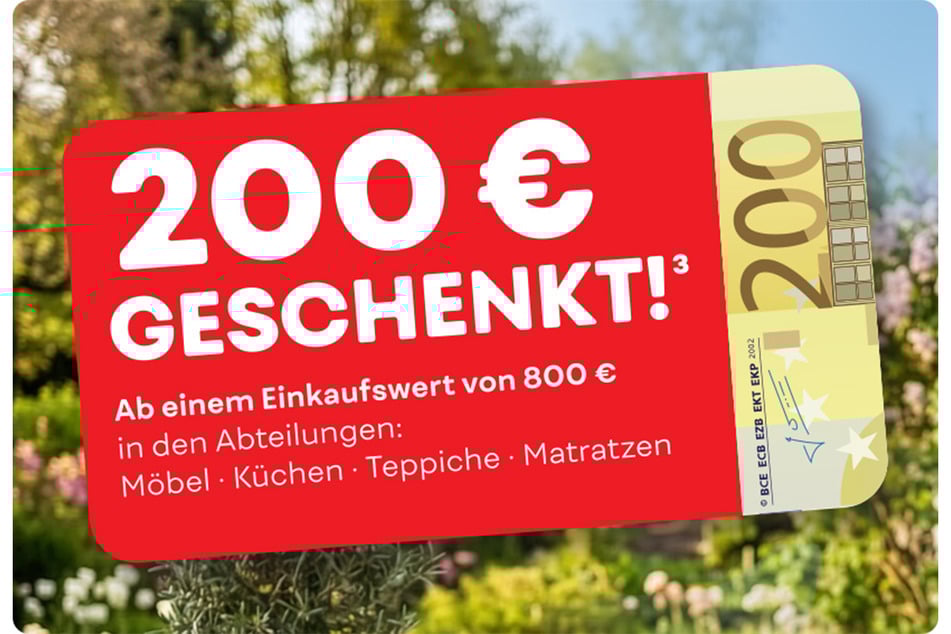 1) +2) +3) +4) Der Betrag wird bei Vorlage des Gutscheins bei Ihrem nächsten Möbel Kraft Einkauf ab einem Warenwert von 60€1/120€2/800€3 bzw. 1.600€4 verrechnet. Der angegebene Gutscheinwert ist innerhalb des Aktionszeitraums (29.04. bis einschließlich 05.05.26) 1x pro Kunde und Kaufvertrag einsetzbar und nicht übertragbar. Barauszahlung nicht möglich, nicht kombinierbar mit anderen Aktionsvorteilen, nicht nachträglich für bereits gekaufte Ware einsetzbar. Ausgenommen sind bereits reduzierte Möbel, Küchen, Teppiche, Matratzen sowie Artikel der Marken Neuhaus, Fischer Honsel, Trio, TK Lighting, Bankamp, Spotlight, ASA, Alfi, Berndes, Justinus Brenger, GEFU, Mepal BV, Nachtmann, Leonardo, WMF, Seltmann Weiden, Silit, Spiegelau, Thermos, Schöner Wohnen, Schöner Wohnen Kollektion, Joop!, Esprit, Tom Tailor,Apelt, Gardisette, Fuggerhaus, Ibena, Biederlack, Bugatti, Florentiner/Wetzel, Saum&Viebahn, Herding, Weckbrodt, Neutex, Estella Ateliers, Janine, Kaeppel, Kleine Wolke, Vossen,Musterring, Sansibar Sylt, Villeroy & Boch. Ebenfalls ausgenommen sind als Tief- oder Kraftpreisgekennzeichnete Artikel, Gartenmöbel, Gutscheine, Bücher und alle Elektroartikel, sowie in dieser Anzeige beworbene Ware. Alle Prospekte finden Sie unter www.moebel-kraft.de.