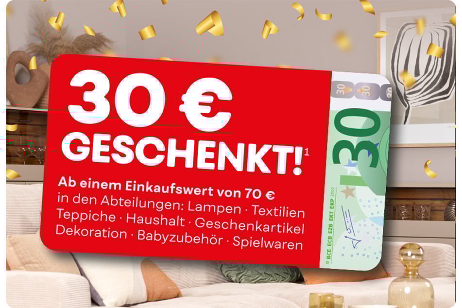 Zusätzlich überrascht der Möbel-Experte mit 30 Euro Rabatt¹ in den Abteilungen Lampen, Textilien, Teppiche, Haushalt, Deko, Geschenkartikel, Babyzubehör und Spielwaren. Wichtig ist dafür, dass der Einkaufswert bei mindestens 70 Euro liegt.