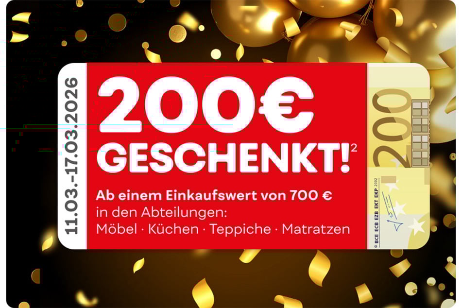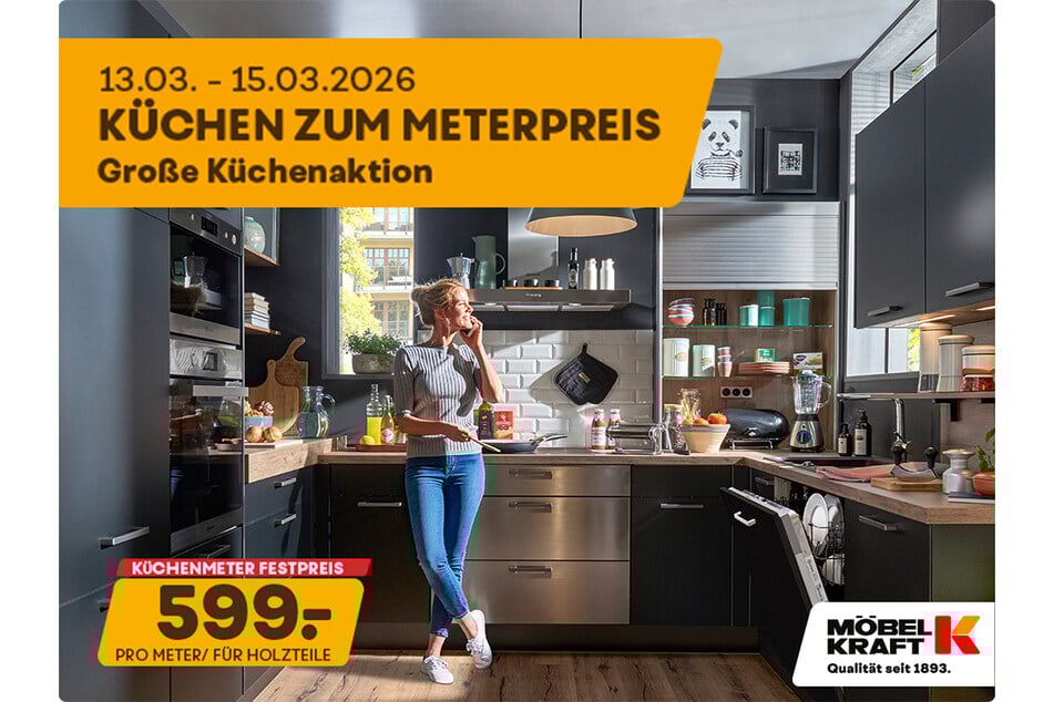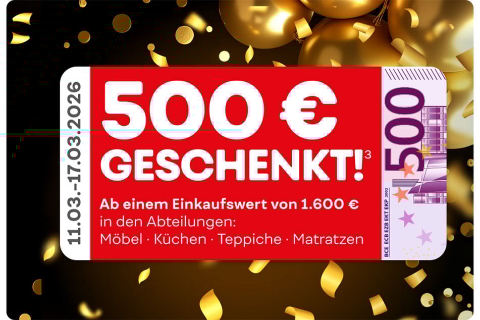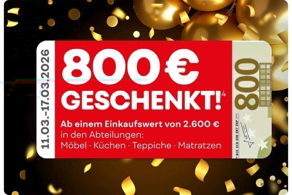 1) + 2) + 3) + 4) Der Betrag wird bei Vorlage des Gutscheins bei Ihrem nächsten Möbel Kraft Einkauf ab einem Warenwert von 70€1/700€2/1.600€3 bzw. 2.600€4 verrechnet. Der angegebene Gutscheinwert ist innerhalb des Aktionszeitraums (11.03.26 bis einschließlich 17.03.26) 1x pro Kunde und Kaufvertrag einsetzbar und nicht übertragbar. Barauszahlung nicht möglich, nicht kombinierbar mit anderen Aktionsvorteilen, nicht nachträglich für bereits gekaufte Ware einsetzbar. Ausgenommen sind bereits reduzierte Möbel, Küchen, Teppiche, Matratzen sowie Artikel der Marken Neuhaus, Fischer Honsel, Trio, TK Lighting, Bankamp, Spotlight, ASA, Alfi , Berndes, Justinus Brenger, GEFU, Mepal BV, Nachtmann, Leonardo, WMF, Seltmann Weiden, Silit, Spiegelau, Thermos, Schöner Wohnen, Schöner Wohnen Kollektion, Joop!, Esprit, Tom Tailor, Apelt, Gardisette, Fuggerhaus, Ibena, Biederlack, Bugatti, Florentiner/Wetzel, Saum&Viebahn, Herding, Weckbrodt, Neutex, Estella Ateliers, Janine, Kaeppel, Kleine Wolke, Vossen, Musterring, Sansibar Sylt, Villeroy & Boch. Ebenfalls ausgenommen sind als Tief- oder Kraftpreis gekennzeichnete Artikel, Gartenmöbel, Gutscheine, Bücher und alle Elektroartikel, sowie in dieser Anzeige beworbene Ware. Alle Prospekte finden Sie unter www.moebel-kraft.de.