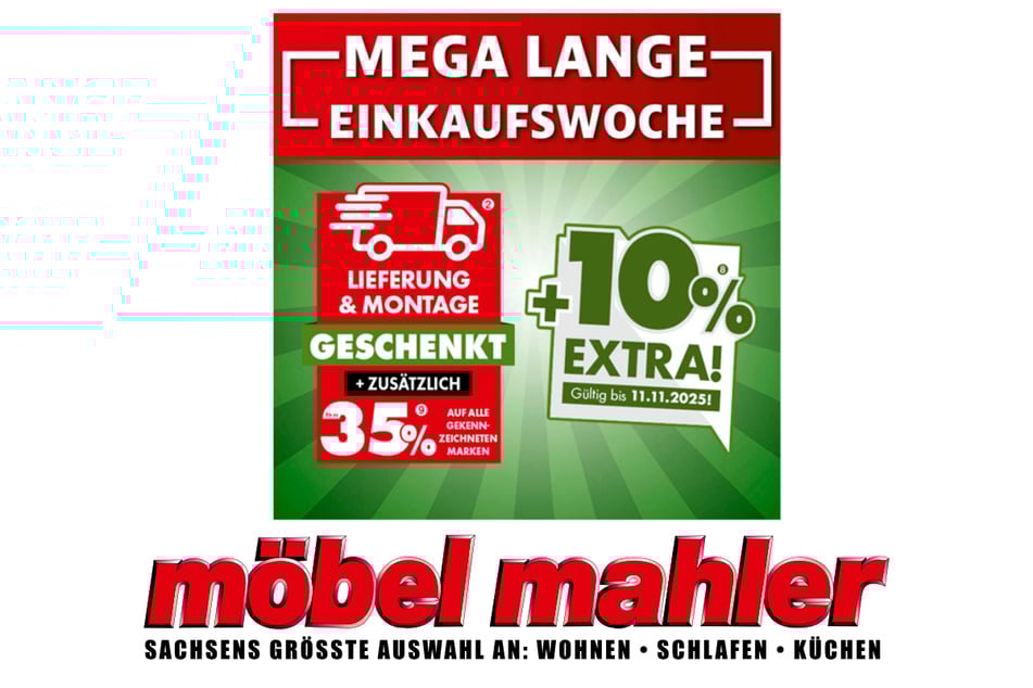 Ausgenommen von dieser Rabattaktion sind Möbel, Küchen, Matratzen, Gutscheine und Bücher und Artikel der Marken ASA Selection, Joop!, Leifheit, Leonardo, Silit, Villeroy & Boch, WMF, Paul Neuhaus und Trio Leuchten. Alle an der Aktion teilnehmenden Artikel in den Prospektbeilagen werden im Aktionszeitraum bereits reduziert angezeigt und gekennzeichnet. Aktuelle Prospekte sind unter www.moebel-mahler-siebenlehn.de einzusehen. Weiterhin ausgenommen sind als Dauertiefpreis gekennzeichnete Artikel. Keine Barzahlung. Nicht mit anderen Rabattaktionen kombinierbar. Gilt nur für Neuaufträge bis einschließlich 25.11.2025.