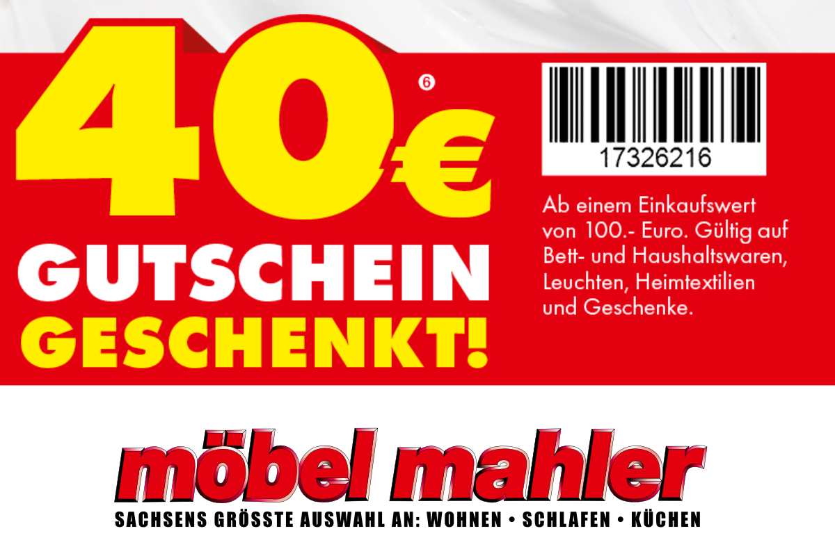 Diesen Betrag verrechnen wir Ihnen bei Vorlage dieses Gutscheins bei Ihrem Möbel Mahler Einkauf ab einem Einkaufswert von 100,-€. Gutschein innerhalb des Aktionszeitraums nur einmal pro Kunde und Kaufvertrag einsetzbar. Ausgenommen von dieser Rabattaktion sind Möbel, Küchen, Matratzen, Gutscheine und Bücher sowie Artikel der Marken ASA Selection, Joop!, Leifheit, Leonardo, Silit, Villeroy & Boch, WMF, Paul Neuhaus und Trio Leuchten. Alle an der Aktion teilnehmenden Artikel in den Prospektbeilagen werden im Aktionszeitraum bereits reduziert angezeigt und gekennzeichnet. Aktuelle Prospekte sind unter www.moebel-mahler-siebenlehn.deeinzusehen. Weiterhin ausgenommen sind als Dauertiefpreis gekennzeichnete Artikel. Nicht mit anderen Rabattaktionen kombinierbar. Barauszahlung nicht möglich. Gilt nur für Neuaufträge bis einschließlich 07.04.2026.