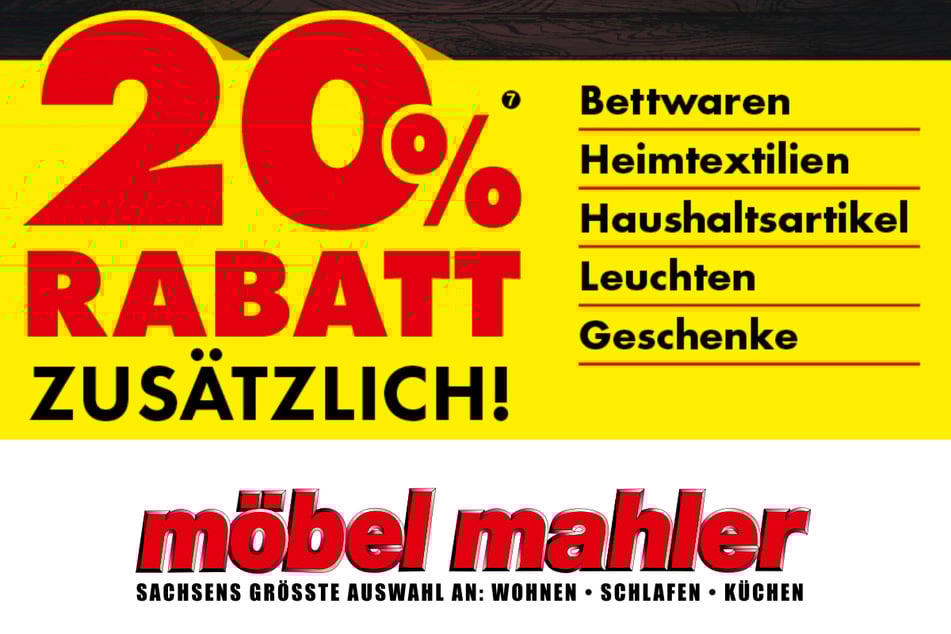 Ausgenommen von dieser Rabattaktion sind Möbel, Küchen, Matratzen, Gutscheine, Bücher und Artikel der Marken ASA Selection, Joop!, Leifheit, Leonardo, Silit, Villeroy & Boch, WMF, Paul Neuhaus und Trio Leuchten. Alle an der Aktion teilnehmenden Artikel in den Prospektbeilagen werden im Aktionszeitraum bereits reduziert angezeigt und gekennzeichnet. Aktuelle Prospekte sind unter www.moebel-mahler-siebenlehn.de einzusehen. Weiterhin ausgenommen sind als Dauertiefpreis gekennzeichnete Artikel. Keine Barauszahlung. Nicht mit anderen Rabattaktionen kombinierbar. Gilt nur für Neuaufträge bis einschließlich 14.04.2026. Gültig nur solange der Vorrat reicht.