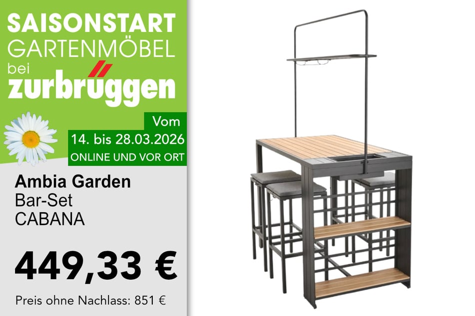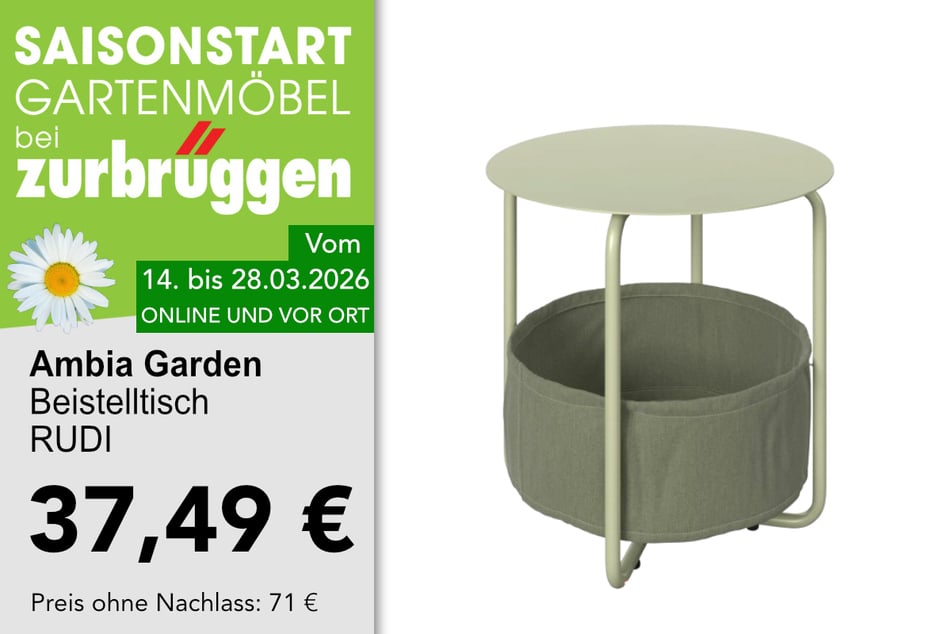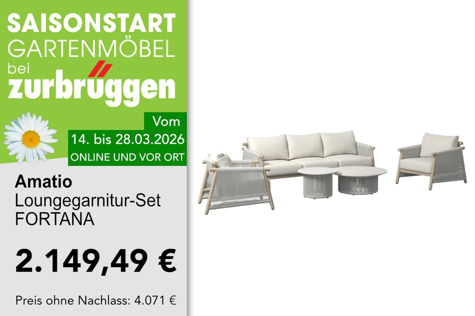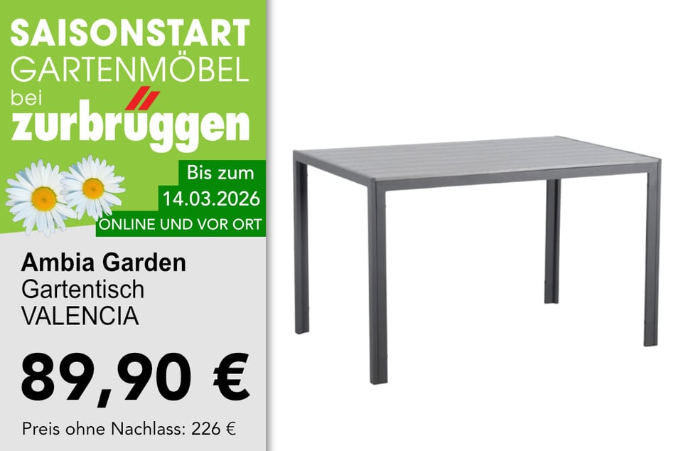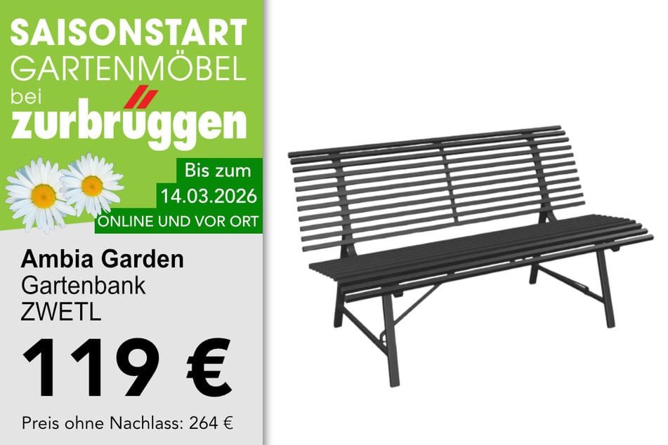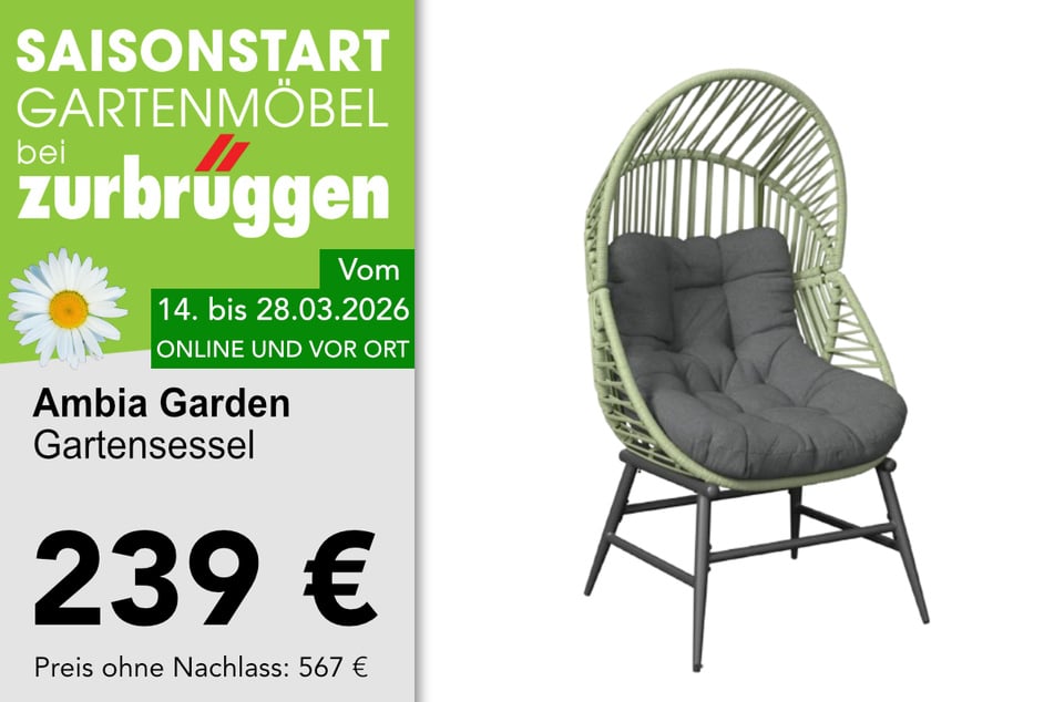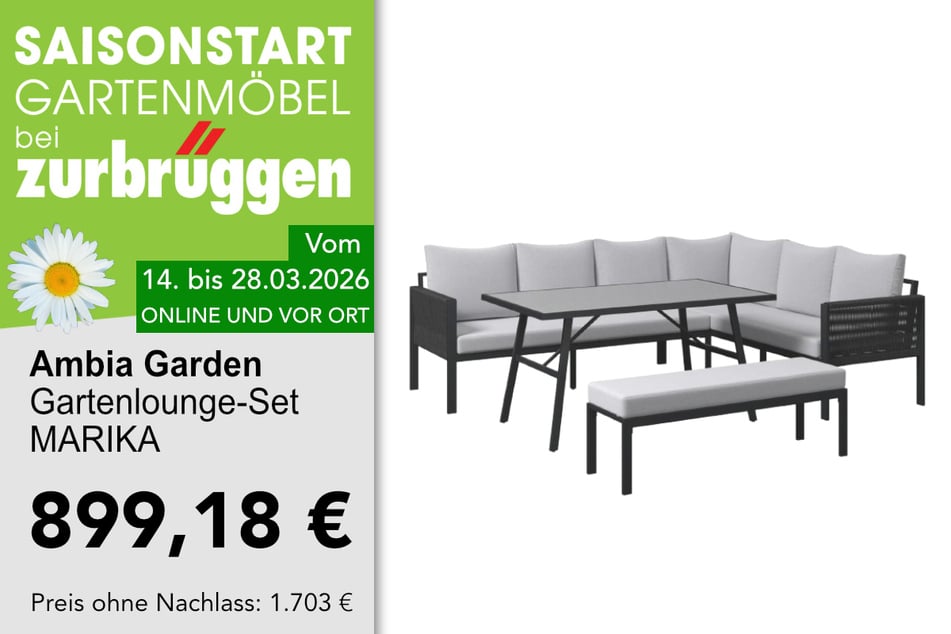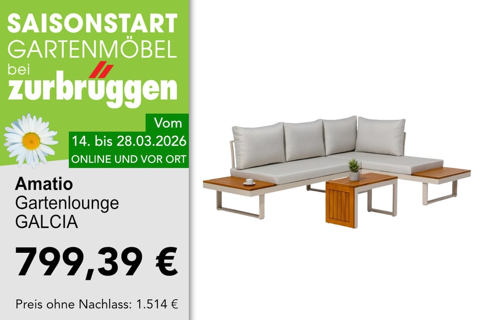 Onlineshop: Gilt für alle Artikel auf dieser Seite https://www.zurbrueggen.de/moebelrabatt/garten/. Nicht kombinierbar mit anderen Rabatt- und Tauschaktionen. Keine Verrechnung mit bereits getätigten Käufen. Ausgenommen sind Artikel mit der Kennzeichnung Werbeaktion. Gültig bis 26.03.2026.