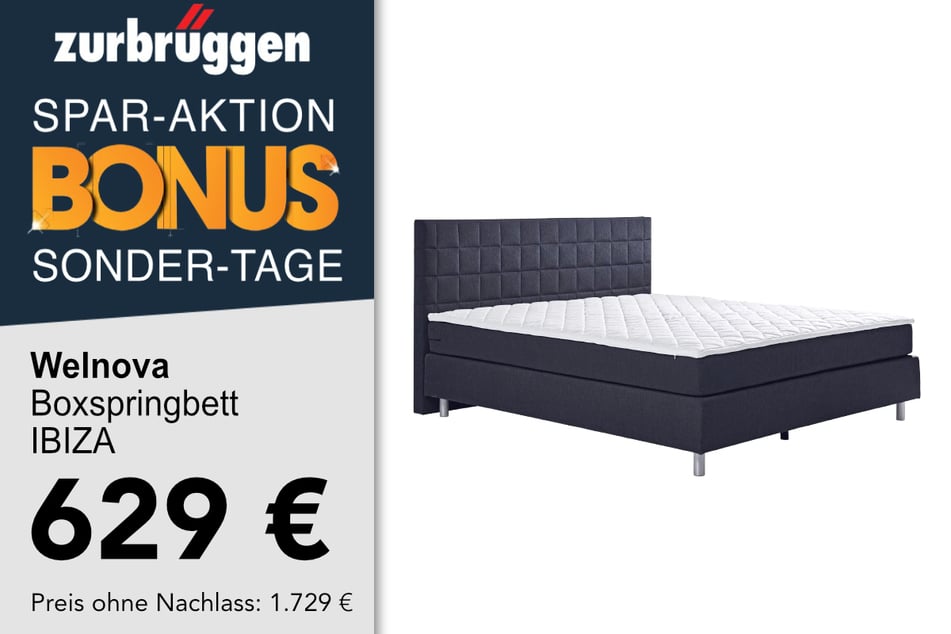 Auch im Schlafzimmer warten im Rahmen der Bonus-Sondertage zahlreiche Angebote rund um erholsamen Schlaf, wie das Welnova Boxspringbett IBIZA für 629 statt 1.729 Euro.