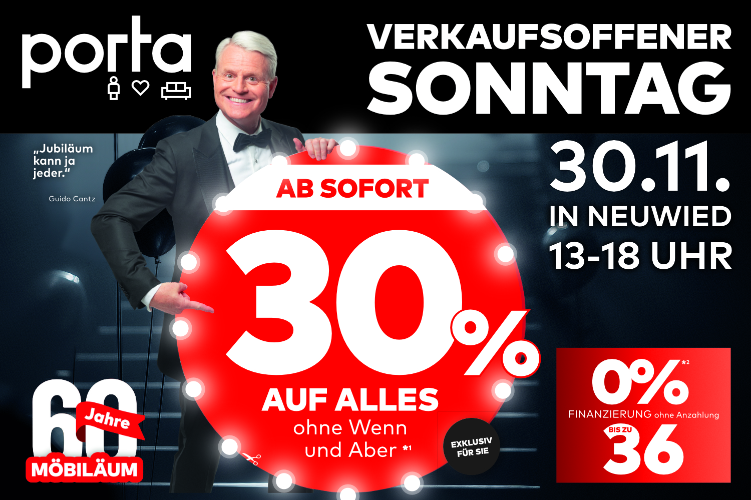 *1 Nicht in Verbindung mit anderen Aktionen und Rabatten. Aktionsbedingungen beim Onlinekauf siehe porta.de. Alle in Anzeigen, Prospekten, postalischen Schreiben und Newslettern angegebenen Preise sind Endpreise, die etwaige Rabatte und Aktionsvorteile bereits beinhalten. Gilt nur für Neukäufe und gegen Vorlage des Coupons vom 28.-30.11.2025.