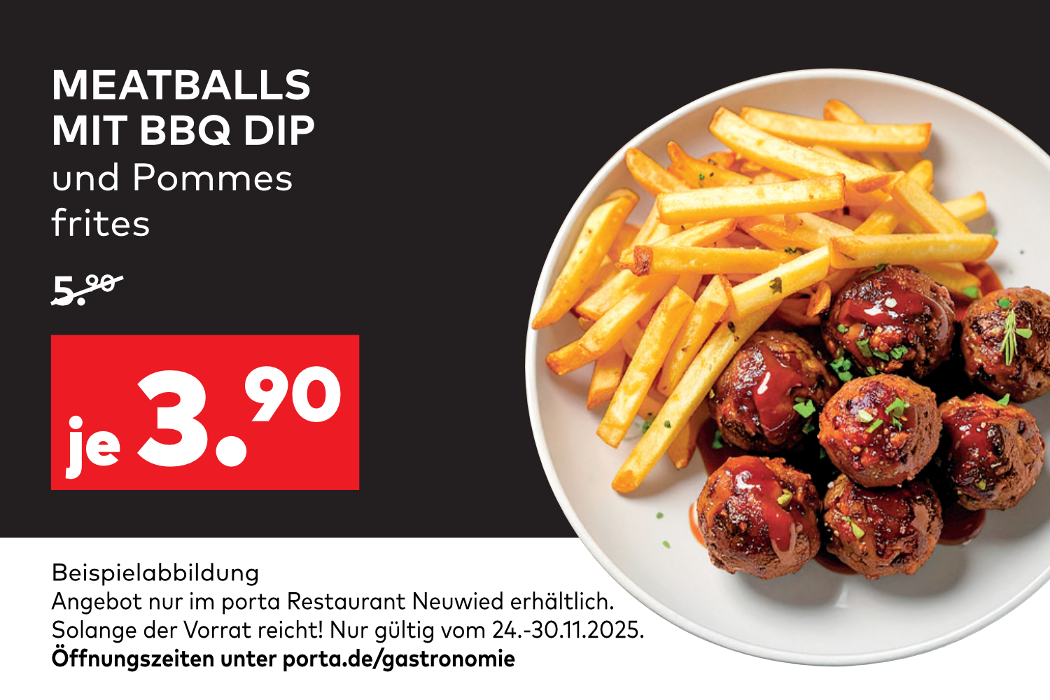 Die Meatballs mit BBQ Dip und Pommes frites stehen z.B. für je 3,90 statt 5,90 Euro auf der Karte.